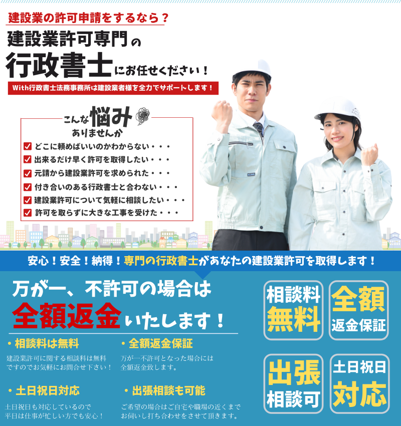 その点、With行政書士法務事務所にご依頼いただいた場合には専門の行政書士が手続きを行うので、ほぼ間違いなく建設業の許可を取得することが可能です。