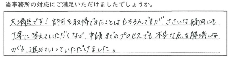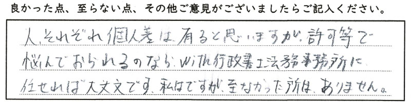 許可取得だけではなく、許可取得後のことも一緒に考えていきたいと考えております。